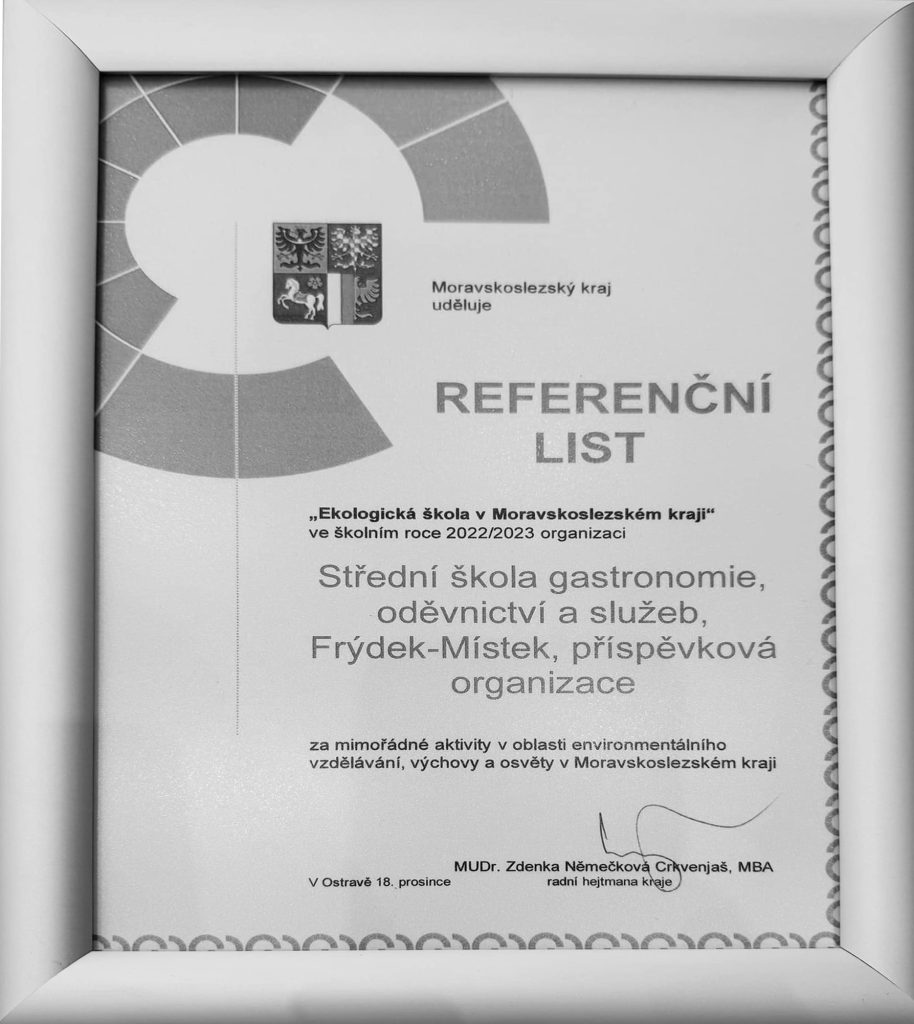 V pondělí 18. 12. 2023 byla naše škola oceněna v soutěži „Ekologická škola v Moravskoslezském kraji ve školním roce 2022/2023“ za mimořádné aktivity v oblasti EVVO. Obdrželi jsme referenční list a věcný dar ve formě dárkového poukazu v hodnotě 5.000,- Kč.