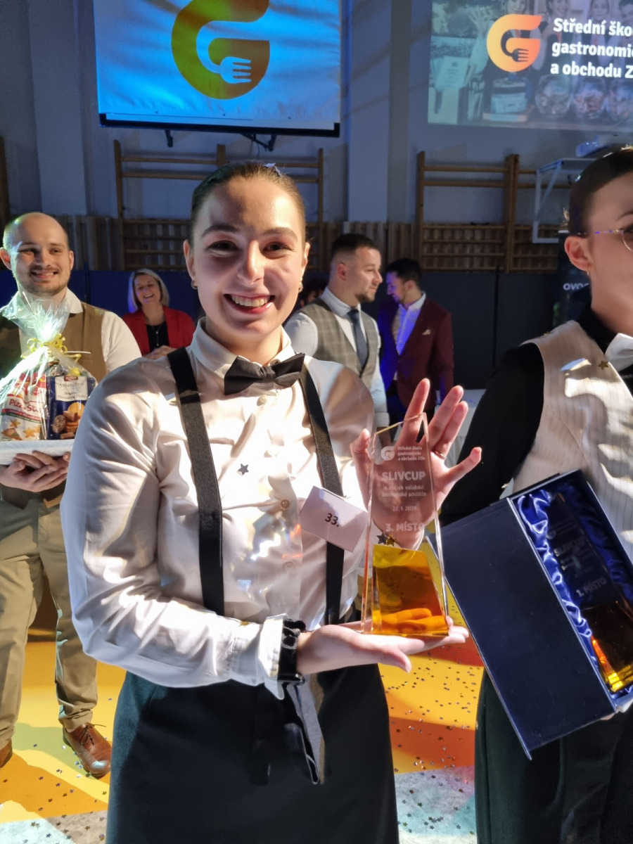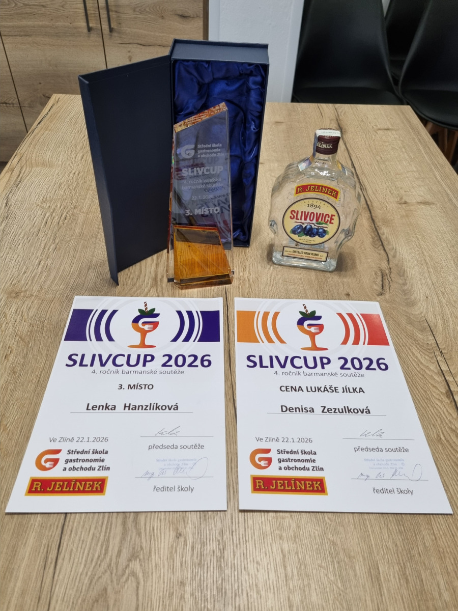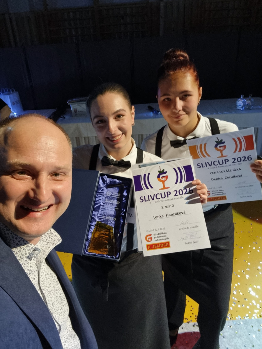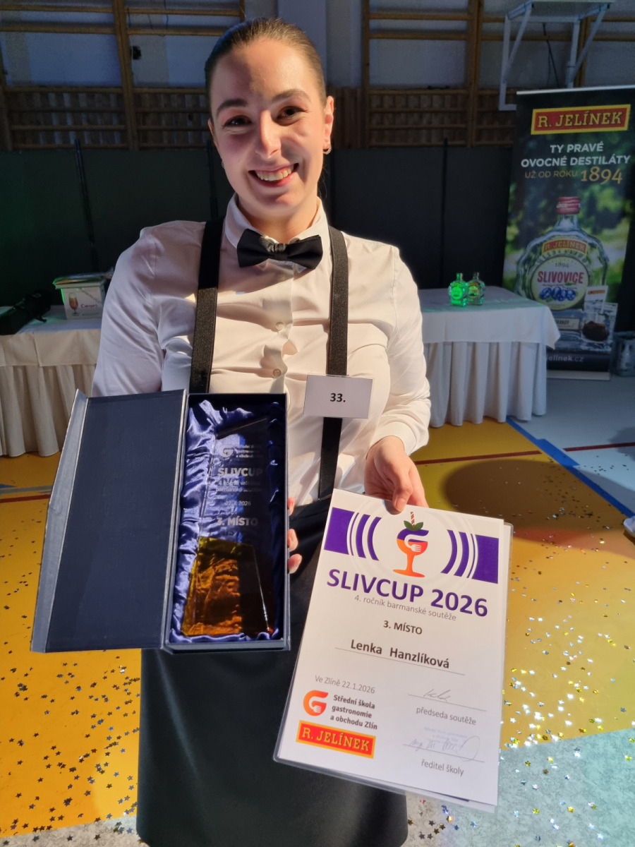 22. ledna se konala mezinárodní barmanská soutěž SLIVCUP 2026 ve Zlíně. A byla to JÍÍÍÍZDA!!!! Letošní rekordní účast 36 soutěžících gastronomických škol Česka, Slovenska a Polska přinesla neskutečnou atmosféru, mimořádné výkony a nápadité koktejly skvělých kvalit. Naše barmanky v našlapané konkurenci excelovaly. Fantastické 3.místo vymíchala Lenka Hanzlíková. Zvláštní ocenění poroty za nejlepší precizní práci získala Denisa Zezulková. Holky, VELKÁ GRATULACE, BYLY JSTE SKVĚLÉ – jsme na vás hrdí. Poděkování rovněž patří panu učiteli Pavlu Štrbovi za skvělou přípravu.
