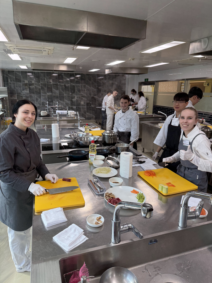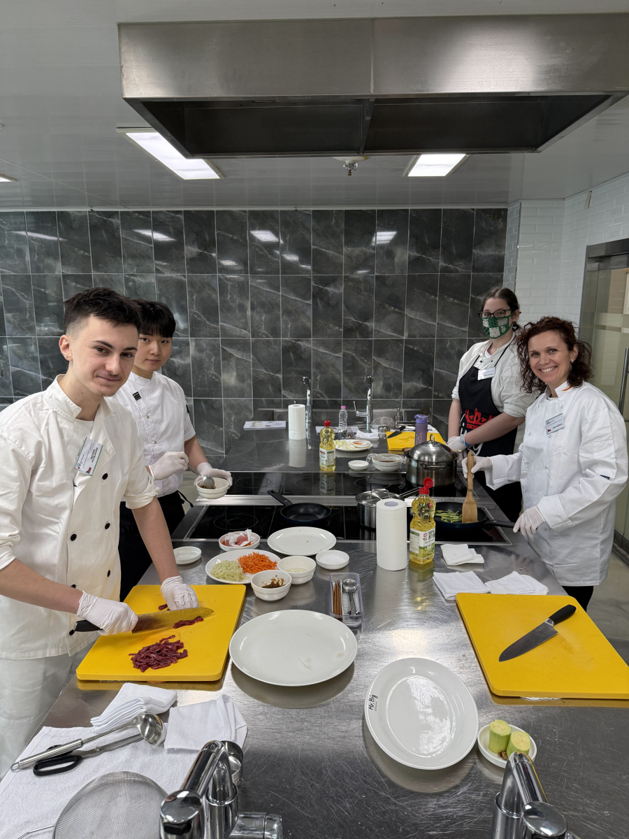 Čeští studenti na oplátku představili tradiční středoevropskou kuchyni. Prezentace českých pokrmů se setkala s velkým zájmem a otevřela prostor pro vzájemnou inspiraci i odbornou diskusi. Andrea i Antonie se aktivně zapojily a důstojně reprezentovaly naši školu i celý region.